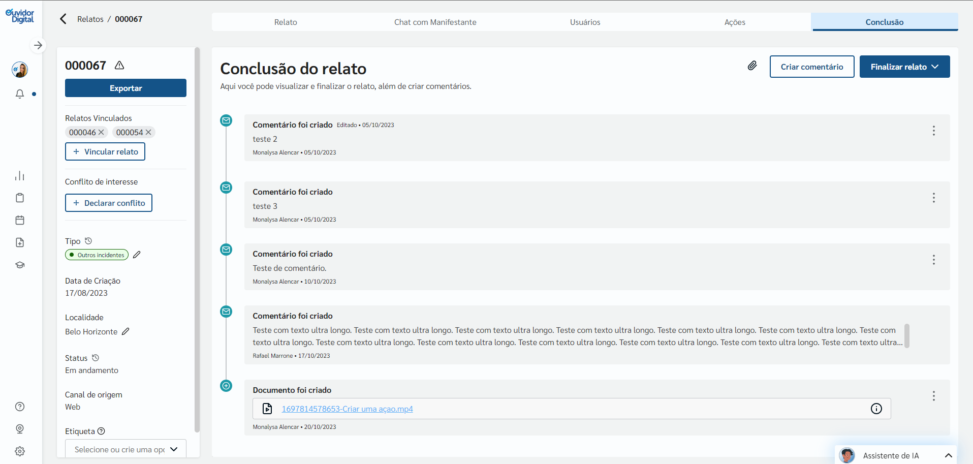 A aba Conclusão e a aba de Ações do Relato são exclusivas para o Comitê de Ética das organizações. Apenas os usuários que possuem acesso ao relato no portal, conseguem visualizar os dados dessas abas. Exceto usuário do tipo Temporário, que só pode ver a aba de Ações do relato no qual foi convidado.