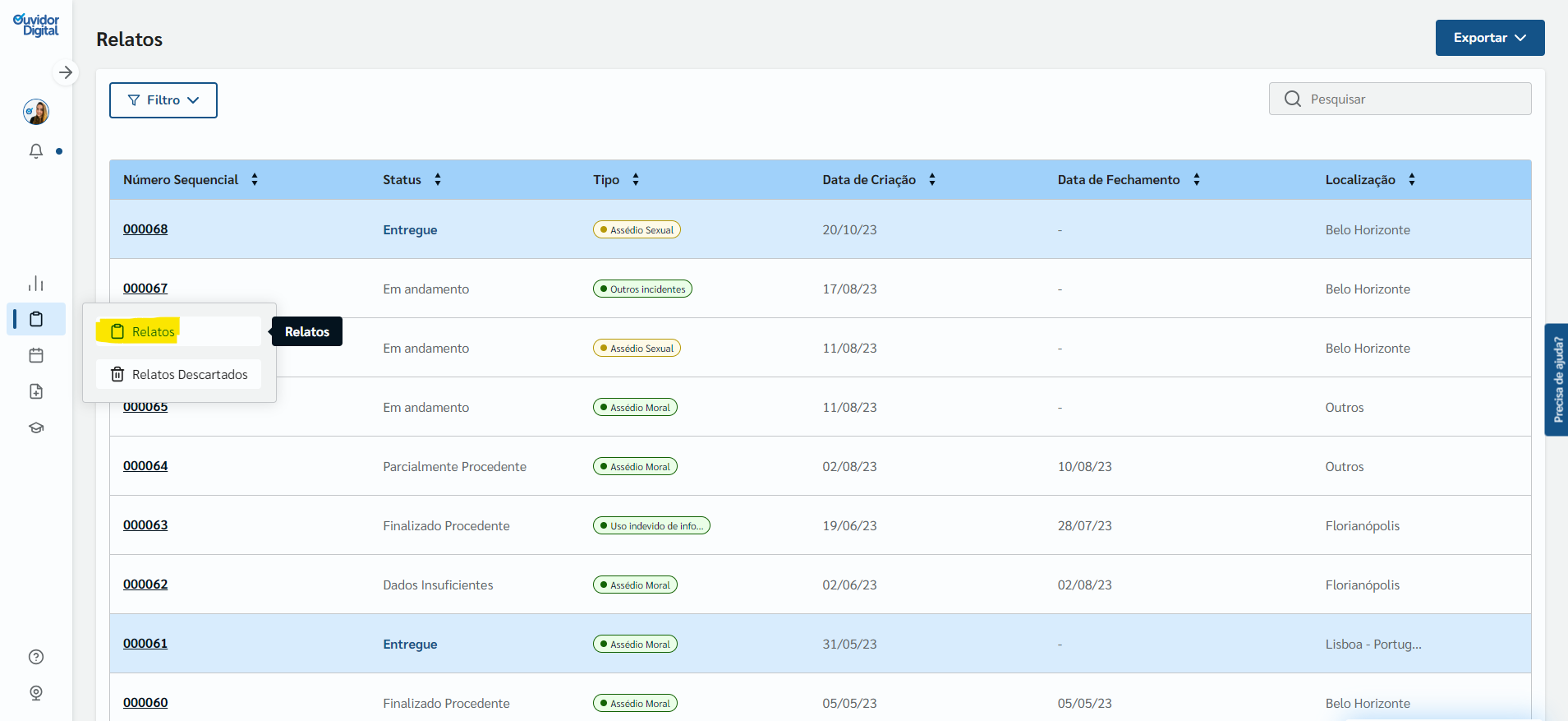 Assim que os dados forem importados com sucesso, eles aparecerão listados na página de relatos, junto com outros incidentes que já tenham sido registrados.