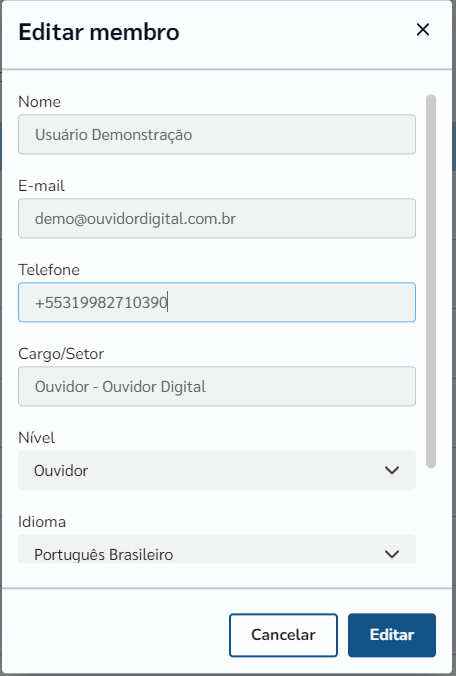 2. Ao abrir a caixa de Editar membro, faça a edição necessária e clique no botão "Editar", confirmando a sua edição.