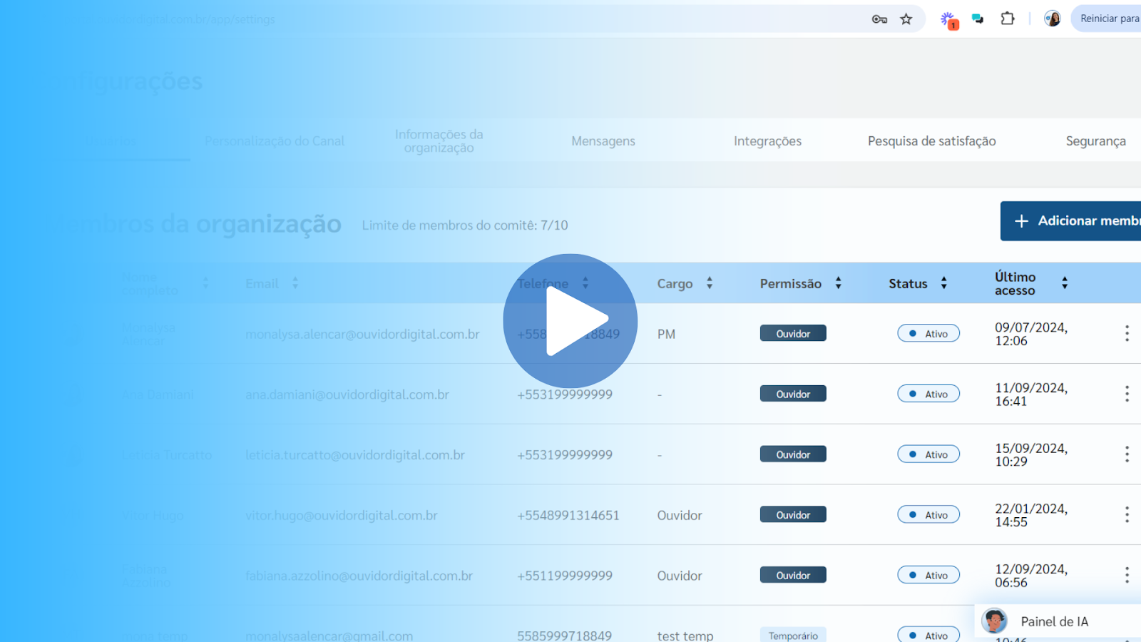 Importante lembrar que só o usuário do tipo Ouvidor consegue fazer inclusão, edição ou exclusão de membro. Mas o usuário do tipo Ouvidor não pode se excluir. Também é importante lembrar que ao cadastrar um novo usuário, caso a pessoa a ser inserida tenha sido mencionada em algum relato já existente, é essencial aplicar de forma imediata a restrição de acesso através da funcionalidade de Conflito de Interesses. Dessa forma, ela não poderá visualizar o relato em que foi citada, garantindo a imparcialidade e a segurança das informações.