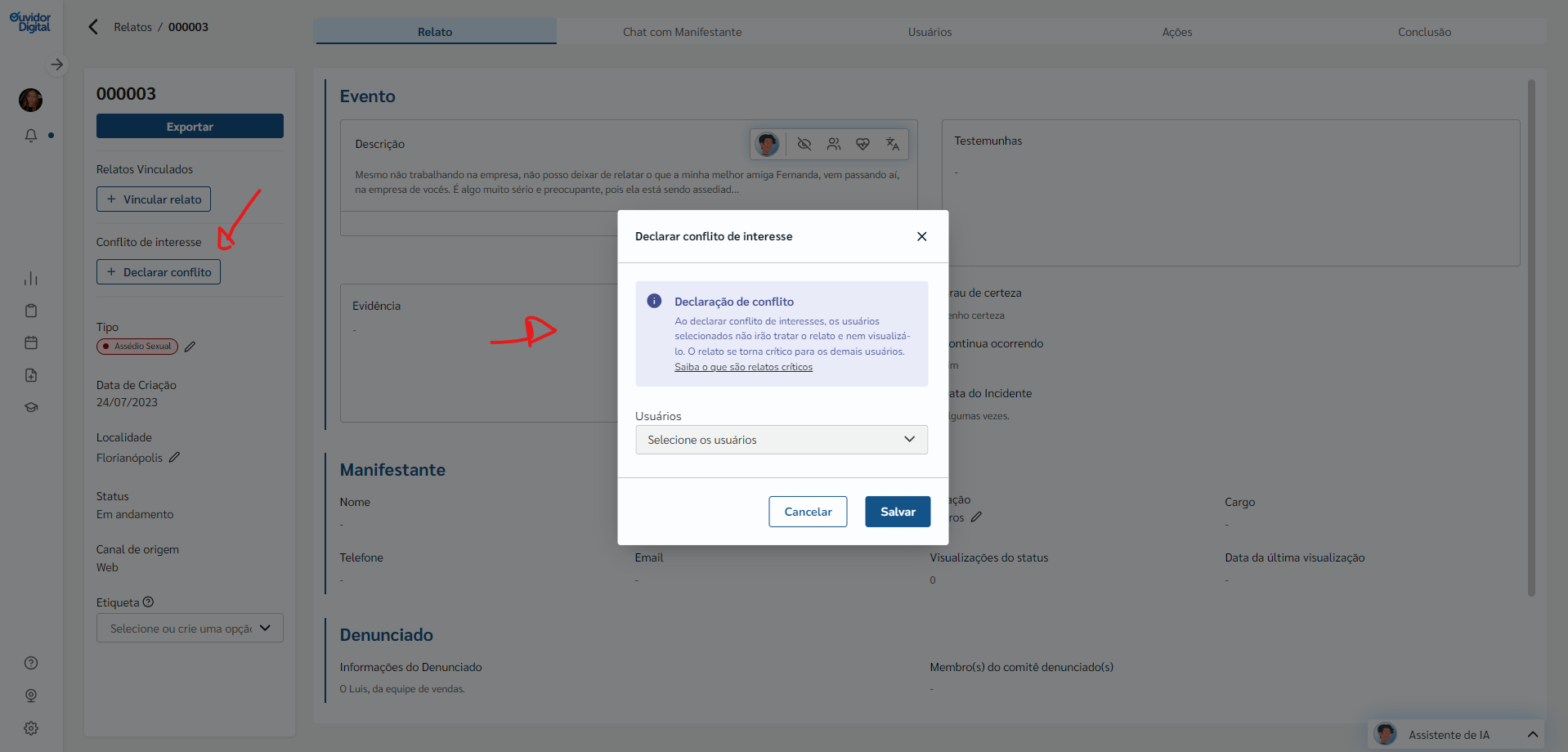 Após declarar conflito de interesses, os usuários selecionados não irão tratar o relato e nem poderão mais visualizá-lo. O relato se torna crítico para os demais usuários.