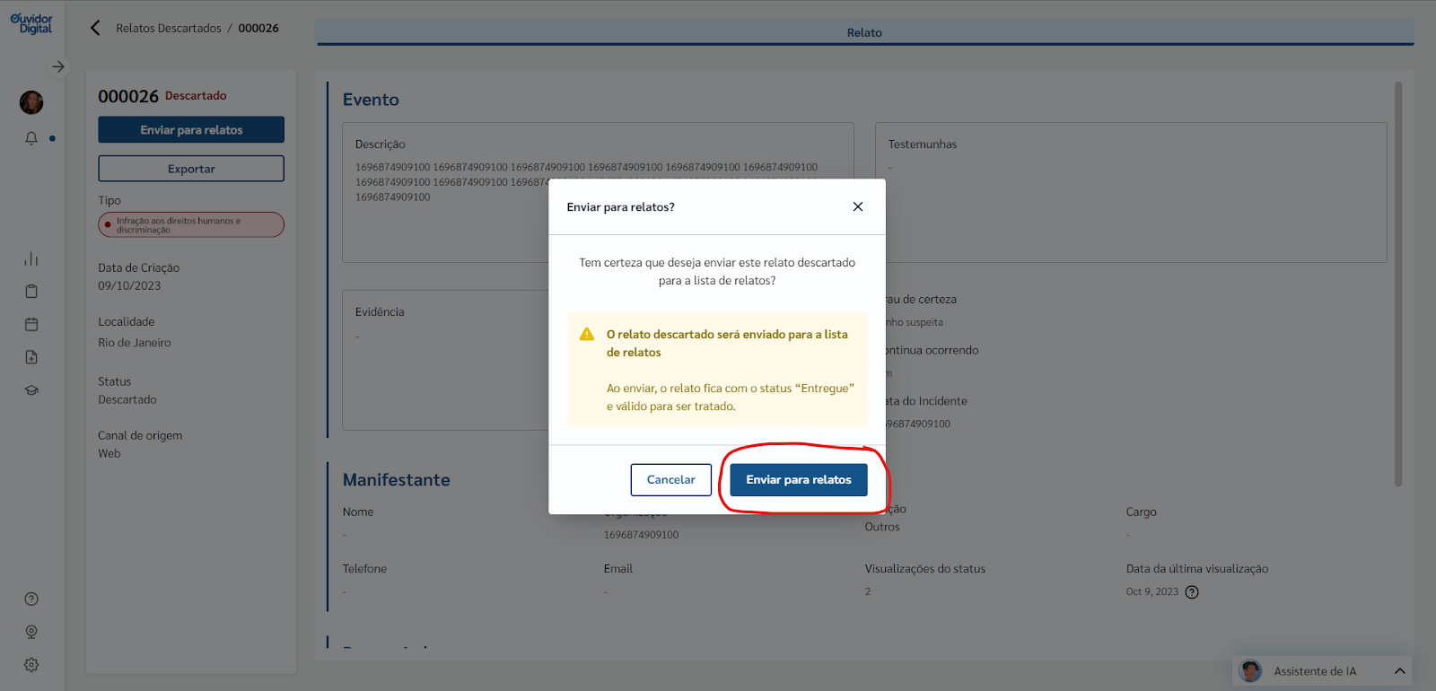 Após avaliação do Comitê, caso queira seguir com o tratamento de um relato que foi descartado, basta enviar esse relato para a lista de Relatos.