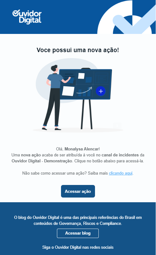 Ao receber um email com o alerta de nova "Ação" no sistema do Ouvidor Digital, clique em “Acessar ação”.