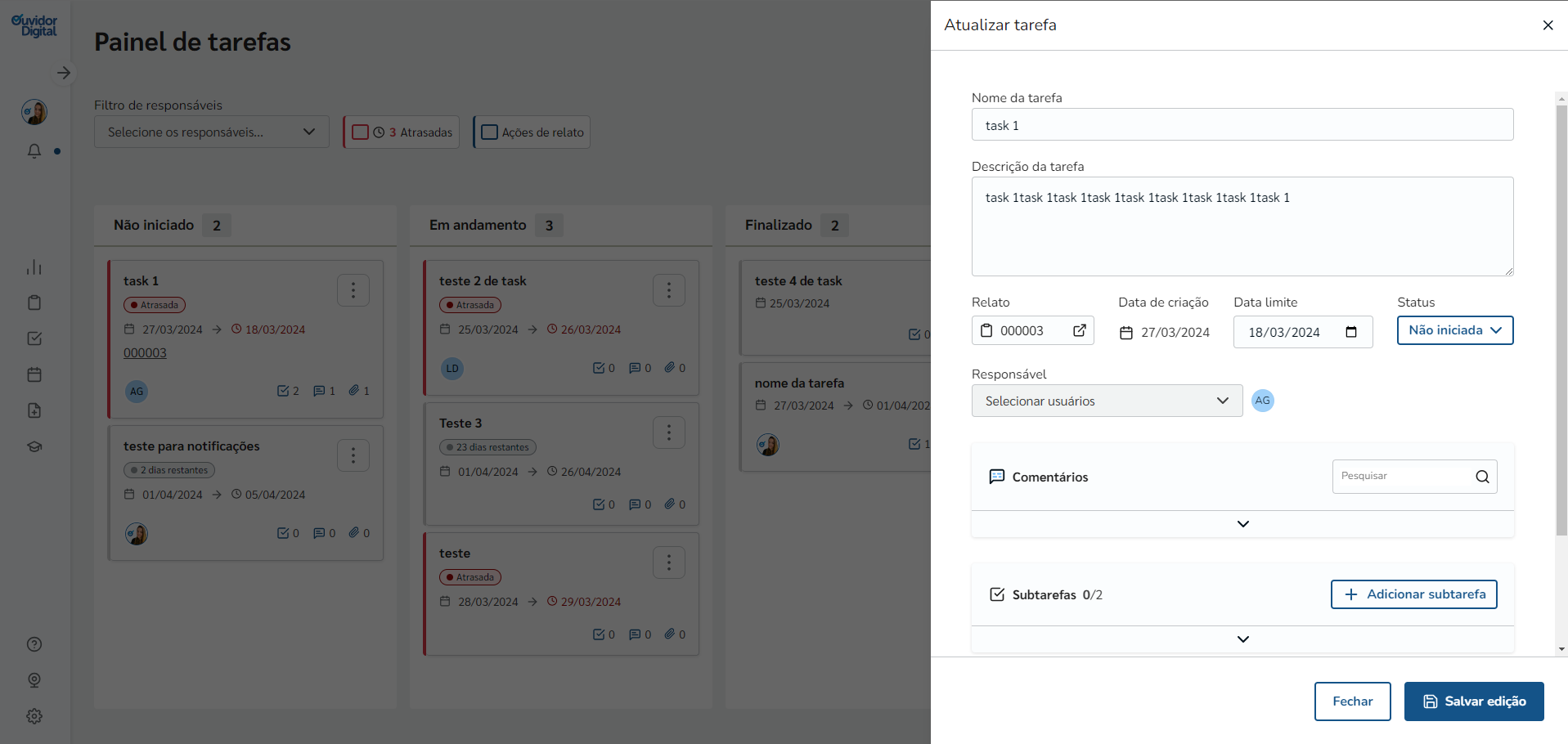 3- Será aberta a tarefa selecionada para que você possa fazer a edição desejada. Além de atualizar o Nome da tarefa, Descrição da tarefa, Data limite, o status e responsável, também é possível adicionar comentários, subtarefas e também arquivos. Caso deseje, também pode editar o relato já relacionado a tarefa. Revise os detalhes editados da tarefa para garantir que estejam corretos e atendam às suas necessidades. Se estiver satisfeito, clique em "Salvar edição".