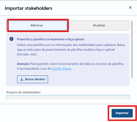 O módulo de SRM permite que você importe stakeholders de forma rápida e organizada, utilizando uma planilha modelo. Isso facilita o cadastro em massa de Pessoas Físicas e Jurídicas com todas as informações necessárias.